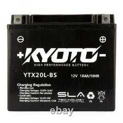 SLA Kyoto Battery for Motorcycle YTX20L-BS SLA / 12V 18Ah New. Kyoto brand lead-acid type SLA battery, new, maintenance-free, ready to use, factory activated, reference YTX20L-BS, type SLA.
