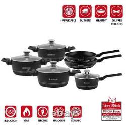 Une répartition homogène de la chaleur est essentielle pour obtenir des résultats de cuisson constants et éviter que les aliments ne brûlent ou ne soient inégalement cuits. Convient aux plaques à induction à gaz vitrocéramique électriques et radiantes: Cela indique que la batterie de cuisine est compatible avec diverses sources de chaleur notamment les plaques à induction les plaques de cuisson à gaz vitrocéramique électriques et radiantes. Il garantit la polyvalence et permet aux utilisateurs d'utiliser la batterie de cuisine sur différents types de cuisinières. Sans PFOA/PLOMB et sans cadmium: Cette caractéristique souligne que la batterie de cuisine est exempte de produits chimiques nocifs tels que le PFOA le plomb et le cadmium ce qui la rend sans danger pour la cuisson et la préparation des aliments. Il garantit aux utilisateurs que la batterie de cuisine répond aux normes de sécurité et favorise des pratiques de cuisson plus saines.Surface résistante aux rayures: le revêtement en marbre est très résistant aux rayures garantissant que la batterie de cuisine conserve son aspect élégant même avec une utilisation régulière dustensiles métalliques. Conception allant au four: chaque pièce de lensemble va au four permettant une transition transparente de la cuisinière au four pour des options de cuisson polyvalentes. Couvercles en verre trempé: lensemble comprend des couvercles en verre trempé qui emprisonnent la chaleur et lhumidité permettant une cuisson efficace tout en offrant une visibilité pour surveiller les aliments sans soulever le couvercle.